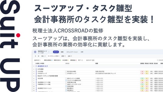 株式会社スーツ(所在地:東京都千代田区、代表取締役社長CEO:小松 裕介)は、チームでかんたん、毎日続けられるプロジェクト・タスク管理ツールの経営支援クラウド「Suit UP」(スーツアップ)において、税理士法人CROSSROAD(所在地:大阪市中央区、代表社員:三嶋 政美)が監修する会計事務所のタスク雛型を追加したことをお知らせします。