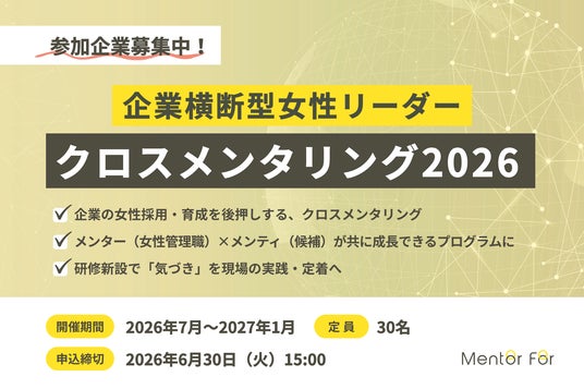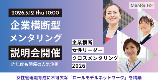 「人生とキャリアの先ゆく先輩=メンター」を軸に、女性リーダー育成と組織のD&I推進に中長期で伴走する株式会社Mentor For(本社:東京都品川区、代表取締役CEO:池原真佐子)は、企業の枠を超えて女性管理職が学び合う「企業横断型女性リーダークロスメンタリング2026」を2026年7月~2027年1月に開催することを決定し、参加企業の募集を開始いたします。