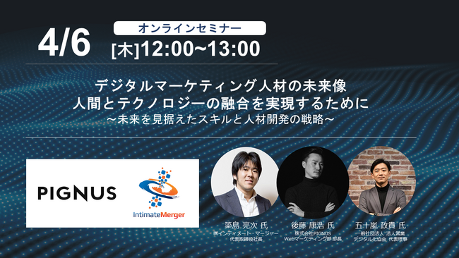 国内最大級パブリックDMPを提供するデータプラットフォームカンパニーの株式会社インティメート・マージャー(本社:東京都港区、代表取締役社長:簗島 亮次、以下当社)は、WEBマーケティングコンサルティング事業を展開する株式会社PIGNUS(本社:東京都千代田区、代表取締役:水戸将平、以下PIGNUS)と共催セミナー「デジタルマーケティング人材の未来像: 人間とテクノロジーの融合を実現するために~未来を見据えたスキルと人材開発の戦略~」を2023年4月6日(木)12時より実施することをお知らせします。