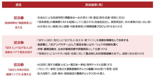 提言1. :削減時間を「価値探索」に変えるための、「余白時間の使い道」の設計を入れるAIによる時間削減効果を「日常業務の消化」で終わらせず、