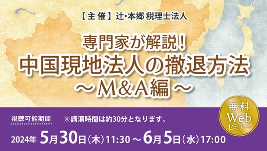 辻・本郷 税理士法人(本社:東京都新宿区、理事長:徳田孝司)は、2024年5月30日(木)より「専門家が解説! 中国現地法人の撤退方法~M&A編~」セミナーを開催いたします。本セミナーでは、撤退方法の中でも、企業が保有する顧客資産や人材資産を継承することができる「M&A」について、中国独特の手続きや留意点を解説します。