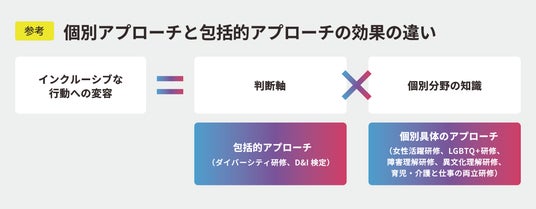 「個別アプローチと包括的アプローチの効果の違い」を示す図。インクルーシブな行動への変容には、「判断軸」と「個別分野の知識」の両方が必要であると説明されています。図の左側には「包括的アプローチ(ダイバーシティ研修、D&I検定)」、右側には「個別具体のアプローチ(女性活躍研修、LGBTQ+研修、障害理解研修、異文化理解研修、育児・介護と仕事の両立研修)」がそれぞれ色分けされて示されており、両者を組み合わせることで効果的なインクルーシブな行動変容が可能であることが視覚的に表現されている。