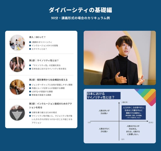 ウェブサイト内に掲載されている、ダイバーシティ研修基礎編の目次やスライド内容のご紹介部分のスクリーンショット。