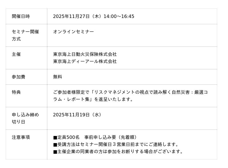 このセミナーは、複合災害という新たなビジネスリスクへの理解を深め、企業のリスクマネジメント能力を強化するためのヒントが得られる貴重な機会です。