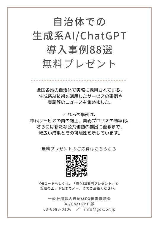 「自治体での生成系AI/ChatGPT 導入事例88選」は、地域社会の問題解決や公共サービスの改善にAI技術を活用している実際の事例を紹介する事例集です。