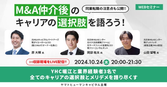 ヤマトヒューマンキャピタル株式会社(本社:東京都千代田区、代表取締役:堀江 大介)は、2024年10月24日(木) 20:00より、ウェビナー『M&A仲介「後」のキャリアの選択肢を語ろう!』を開催いたします。本ウェビナーは番組収録を兼ねており、タイトルコールの言い直しなどやや見にくい点が発生する可能性が御座います。「編集前の生のコンテンツならでは」ととらえて頂き、お楽しみ頂ければ幸いです。