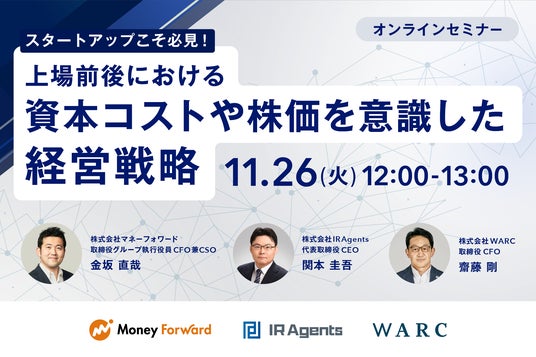 成長企業の経営管理支援事業を展開する株式会社WARC(本社: 東京都品川区、代表取締役社長: 山本 彰彦、以下「WARC」)は、株式会社マネーフォワード様、株式会社IR Agents様をゲストにお招きし「~スタートアップこそ必見!~上場前後における資本コストや株価を意識した経営戦略」と題しオンラインセミナーを開催することをお知らせします。
