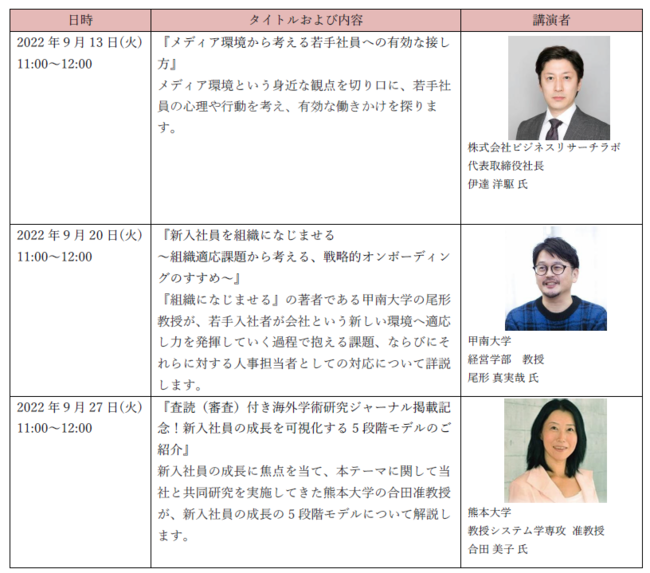 そこで新規学卒入社者の研修を数多く手がけてきた当社は、新入社員をはじめとした次年度の若手社員の育成企画に有用なセミナーを企画しました。3つの切り口でそれぞれ1回、3回にわたって実施するもので、若手社員そのものの特徴を皮切りに、若手社員の組織適応と能力発揮、そして成長のステップについて解説します。