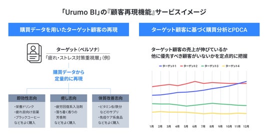 生成AIを活用した購買データ分析ソリューション 「Urumo BI(ウルモ ビーアイ)」(特許取得)にて、商品ブランドのターゲット顧客/ペルソナをリテールデータプラットフォーム「Urumo(ウルモ)」上で商品属性データと紐づけた購買データから再現し、「Urumo BI」による購買実績の定点観測や
