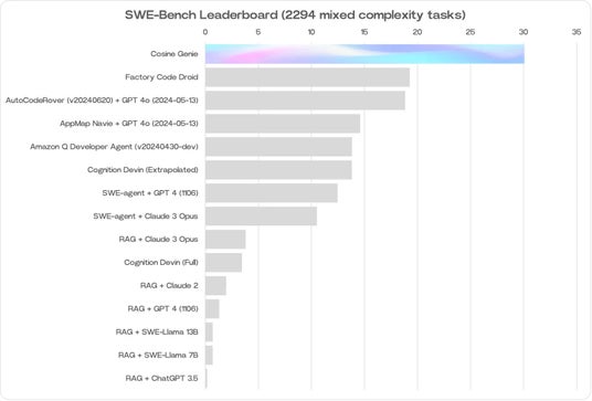 SWE-Benchは、AIモデルのソフトウェアエンジニアリング能力を評価する世界的な業界ベンチマークです。ソフトウェアエンジニアが日々の業務で直面する問題の深掘りや関連するコードの発見と活用、実装についての能力を評価しています。この度、Cosineの提供するGenieはSWE-Benchで30.08%を達成し、従来の世界スコアである19%から大幅に改善したスコアを記録しました。