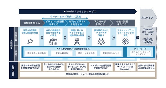 「X-Health(R)」では、クライアントの状況やプロジェクトの特性、テーマに応じて3つのサービスメニューをご用意し、クライアントが抱える課題に対応した支援を行います。