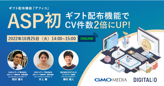 株式会社CARTA HOLDINGSのグループ会社で、マーケティングソリューション事業を展開する株式会社DIGITALIO (東京都渋谷区、代表取締役:古谷 和幸)が運営するデジタルギフト「デジコ」( https://digi-co.net/ )は、GMOインターネットグループのGMOメディア株式会社(代表取締役社長:森 輝幸 以下、GMOメディア)が運営する、アフィリエイトサービスプロバイダ(ASP)(※1)「アフィタウン byGMO」と共催で、2022年10月25日(火)、アフィリエイト担当者を対象とした無料オンラインセミナー「アフィリエイトメディア向けのメディア収益アップノウハウセミナー」を開催いたします。
