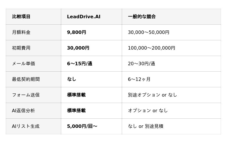 LeadDrive.AIは初期30,000円+月額9,800円+最小クレジット15,000円の合計54,800円で本格運用を開始できます。2ヶ月目以降は月額9,800円+使った分だけ。