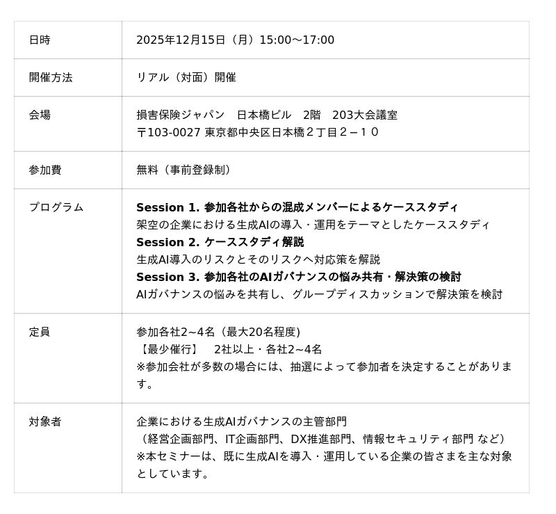 企業の多種多様なリスクマネジメント・コンサルティングサービスを提供するSOMPOリスクマネジメント株式会社は、前回2025年6月に開催しご好評いただいた「生成AIガバナンスワークショップ」を2025年12月15日(月)に再開催することをお知らせいたします。