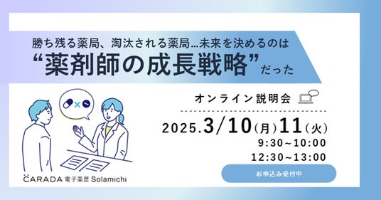 クラウド電子薬歴『CARADA 電子薬歴 Solamichi』の企画・開発・販売を行う株式会社ソラミチシステムは、無料オンラインセミナー「勝ち残る薬局、淘汰される薬局…未来を決めるのは“薬剤師の成長戦略”だった」を2025年3月10日(月)、11日(火) に開催します。