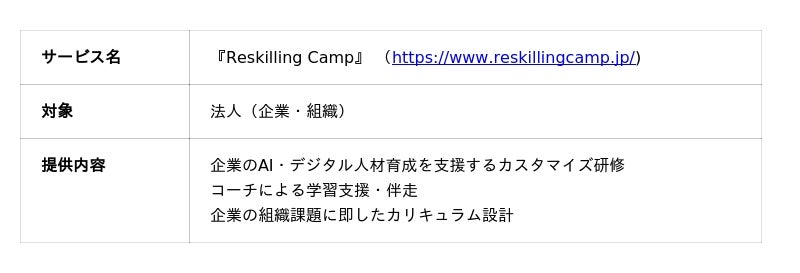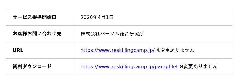 株式会社パーソル総合研究所(本社:東京都江東区、代表取締役社長:岩田 亮)は、このたび、パーソルイノベーション株式会社(本社:東京都港区、Reskilling Camp Company代表:柿内 秀賢)が提供してきた法人向けリスキリング支援サービス『Reskilling Camp(以下、本サービス)』について、2026年4月1日で当社が運営主体を引き継ぎ、提供を開始することになりました。