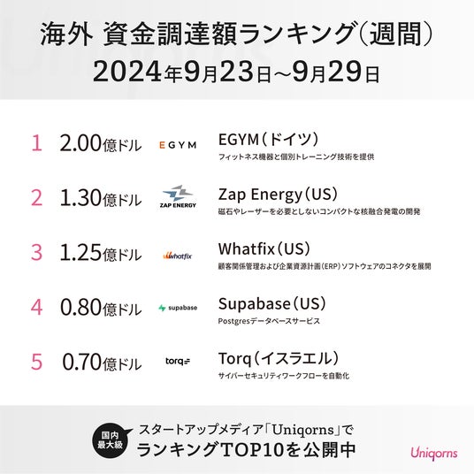 国内最大級のスタートアップメディア「Uniqorns(ユニコーンズ)」が海外2024年9月23日~9月29日のスタートアップ資金調達状況をランキング形式で発表