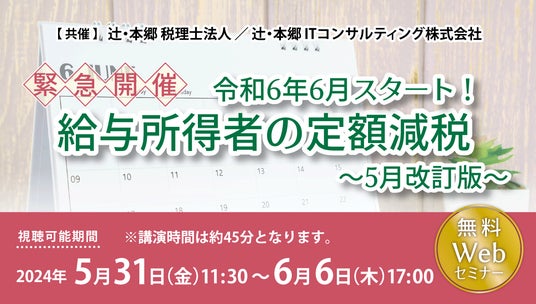 辻・本郷 税理士法人(本社:東京都新宿区、理事長:徳田孝司)と辻・本郷 ITコンサルティング株式会社(本社:東京都渋谷区、代表取締役社長:黒仁田健)は、2024年5月31日(金)より共催で「【緊急開催】令和6年6月スタート! 給与所得者の定額減税~5月改訂版~」セミナーを開催いたします。令和6年度税制改正大綱により、令和6年分の所得税・住民税の定額減税が実施されることが決定されました。給与支払い担当者は、定額減税対象者の、6月1日以降に支払われる給与等に対する源泉徴収税額から、定額減税額を控除する作業が発生します。そして、年末調整時点の定額減税額に基づいた精算を行う作業も必要です。本セミナーでは、給与担当者の実務に沿って、準備すべきポイントと、各種帳票類の記載方法等について解説します。