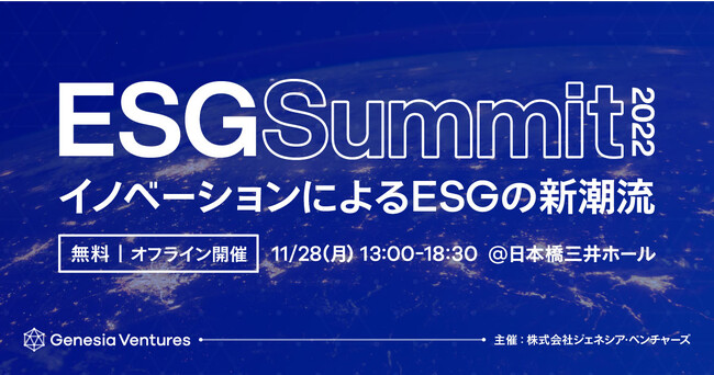 株式会社ジェネシア・ベンチャーズ(代表取締役:田島 聡一、本社:東京都港区)は、来たる2022年11月28日(月)にオフラインイベント「ESG Summit 2022~イノベーションによるESGの新潮流~」(以下:ESG Summit 2022)を開催いたします。