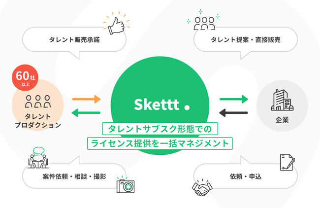 Skettt(スケット:https://skettt.com/)は、事務所提携数60社・交渉可能タレント数800名以上のタレントサブスクサービスです。