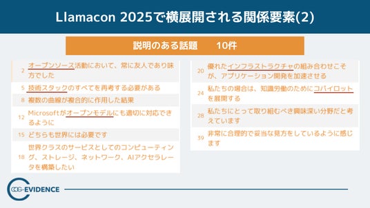 知識表現AIを用い、会話・文章情報から組織課題を可視化するコグニティ株式会社(本社:東京都品川区、代表取締役:河野理愛、以下「コグニティ」)は、Metaが開催した「LlamaCon 2025」を対象に、キーノートの発話構造を分析した調査レポートのサマリーを公開しました。LlamaCon 2025は、ライブ感を持たせながら話は具体的な点から始まり、様々に分岐しながら主題を語るという構造上の特徴を示しました。さらに話題の群を確認すると、その分岐は単なる論点の多さではなく、AI時代の重要要素を横に並べて展開させながら関連付けて全体像を提示する“進み方”として現れていました。
