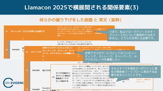 ■ コグニティの示唆 今回のMeta LlamaCon 2025では、ストーリーの分岐は「話題が多いこと」や「主題の散漫さ」を意味していませんでした。オープン/クローズド、インフラ、コパイロット、ワークフロー統合など、AI時代を支える複数の重要要素を横に展開して関係づけし、全体像として理解させるための進ませ方として分岐が現れていました。