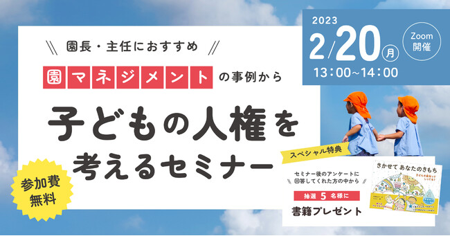 BABY JOB株式会社(本社:大阪府大阪市、代表取締役社長 上野公嗣)は、「園マネジメントの事例から子どもの人権を考える」をテーマに、大阪教育大学教授の小崎 恭弘先生のご登壇による無料オンラインセミナーを、2023年2月20日(月)13:00にZOOMで開催します。