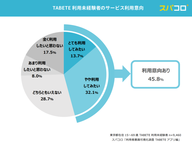 TABETEの利用未経験者のうちTABETEのようなサービスを利用したいと考える人はどれくらいいるのでしょうか?TABETEの利用未経験者にサービス概要を明示し利用意向を聴取したところ「とても利用してみたい」13.7%、「やや利用してみたい」32.1%、「どちらともいえない」28.7%、「あまり利用したいと思わない」8.0%、「全く利用したいと思わない」17.5%という結果に。TABETEを“利用してみたい”と回答した人は合計で45.8%と約5割に利用意向が見られることがわかりました。