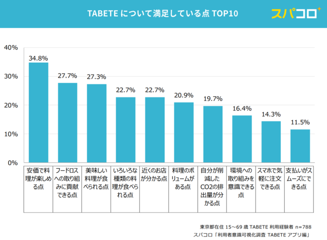 TABETEについて満足している点は上位から、「安価で料理が楽しめる点」34.8%、「フードロスへの取り組みに貢献できる点」27.7%、「美味しい料理が食べられる点」27.3%、「いろいろな種類の料理が食べられる点」22.7%、「近くのお店が分かる点」22.7%が続いています。
