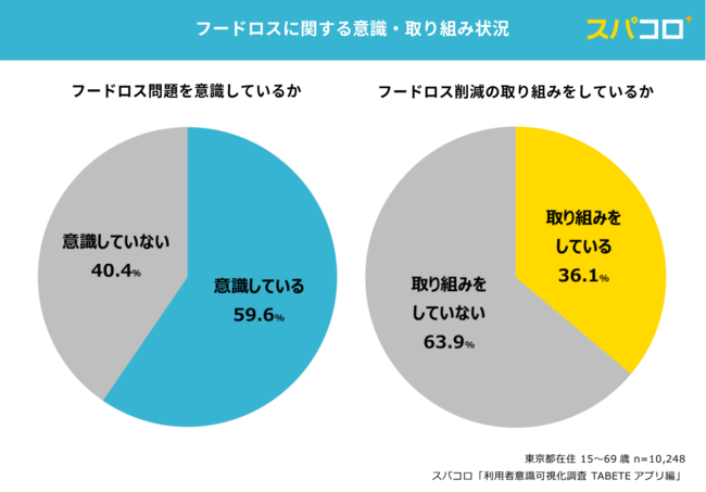 東京都在住の15~69歳の10,248人に聞いたフードロスに関する取り組み状況では、『フードロス問題を意識しているか』という質問では、「意識している」59.6%、「意識していない」40.4%。『フードロス削減の取り組みをしているか』という質問では、「取り組みをしている」36.1%、「取り組みをしていない」63.9%。都民の約6割がフードロス問題を意識しており、約4割が実際にフードロス削減の取り組みをしていることがわかる結果となりました。