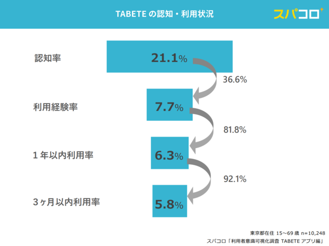 東京都在住の15~69歳の10,248人に聞いたTABETEの認知・利用状況についてみてみると、認知率21.1%、利用経験率7.7%、1年以内利用率6.3%、3ヶ月以内利用率5.8%。都民の約2割がTABETEを認知しており、認知者の約4割に利用経験があることがわかります。