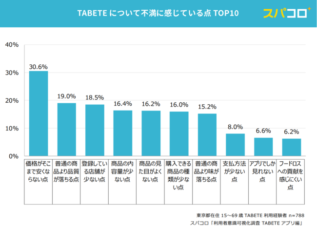 TABETEについて不満に感じている点は上位から「価格がそこまで安くならない点」30.6%、「普通の商品より品質が落ちる点」19.0%、「登録している店舗が少ない点」18.5%、「商品の内容量が少ない点」16.4%が続いています。