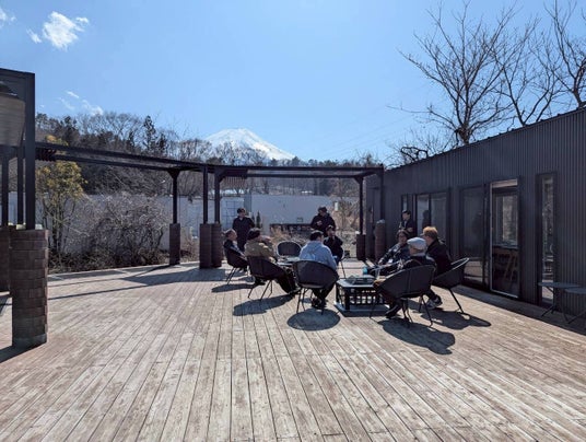 BLANC FUJI(DAY2 視察先:山梨県富士吉田市) 富士山の麓、清流・桂川に隣接する自然共生型ホテル。客室露天風呂やプライベートサウナを備え、「五感で自然を感じ、余白を体感する」滞在を提供しています。本合宿では共創拠点「DICT BASE FUJI」として視察を行い、参加者が次なるプロジェクトへ向けたインスピレーションを得る場となりました。