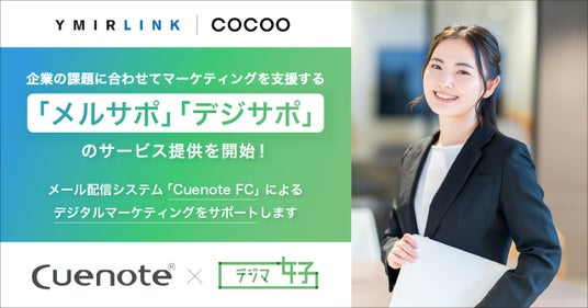 メッセージングプラットフォーム「Cuenote(キューノート)」を提供するユミルリンク株式会社(本社:東京都渋谷区、代表取締役社長:清水 亘)は、「人財」×「デジタル」事業で社会のDX化を支援するコクー株式会社(本社:東京都千代田区、代表取締役CEO:入江 雄介)と提携し、メール配信システム「Cuenote FC」を導入または検討中の企業向けに、メールマーケティングやデジタルマーケティングのサポートを行う新サービス「メルサポ」「デジサポ」の提供を開始いたします。
