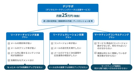 新サービス「メルサポ」および「デジサポ」は、企業のデジタル課題を解決・DX化を支援するコクー株式会社と提携し、「Cuenote FCの効果的な使い方が分からない」「メールマーケティングやデジタルマーケティングで成果改善をしたい」等のお悩みに対応し、2種類から選べるプランで企業の課題に応じたサポートを行います。