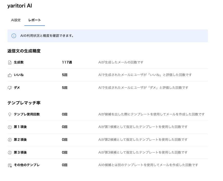 今回のアップデートでは、AIエージェントの使用回数や、生成された返信文に対する評価(「いいね」「ダメ」など)を可視化できるレポート機能を新たに追加しました。これにより、AI導入担当者は現場での活用状況や成果を定量的に把握し、導入効果を社内に説明・検証しやすくなります。