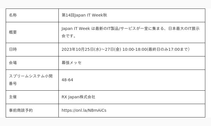 スプリームシステム株式会社(東京都豊島区:代表取締役社長兼CEO 渡部 知博)は、2023年10月25日(水)~27日(金)に幕張メッセで開催される第14回Japan IT Week秋に出展いたしますので、以下のとおりご案内申し上げます。