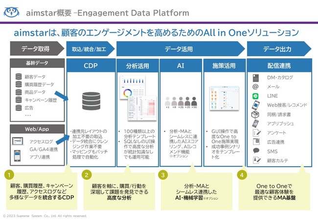 スプリームシステムでは、BtoC企業様向けのマーケティングオートメーションや、カスタマーデータプラットフォームを搭載したEngagement Data Platform「aimstar(エイムスター)」をご紹介いたします。