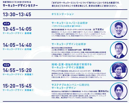 本セミナーでは、サーキュラーデザインをビジネスに取り入れるためのヒントを得る機会として、サーキュラーデザインの基礎から実践紹介までを分かりやすく解説します。