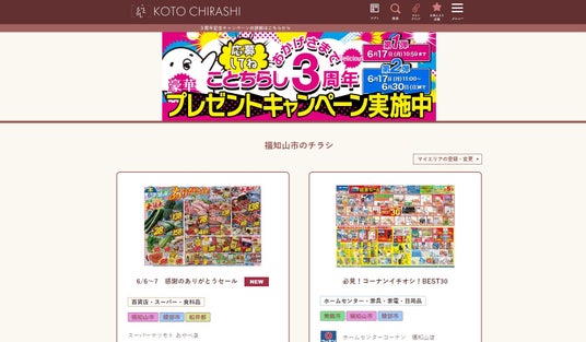 株式会社京都新聞社京都新聞グループの京都新聞折込サービスセンターが運営するデジタルチラシサービス「ことちらし」は3周年記念プレゼントキャンペーンを実施しています。今後も定期的なプレゼントキャンペーンの実施を予定していますので、賞品のご協賛などご検討頂ける企業様は当社までご連絡ください。