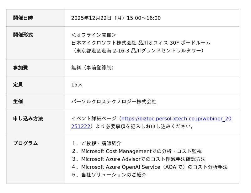 パーソルクロステクノロジー株式会社~12月11日、22日にAzure/AIコストに関するセミナーを開催~