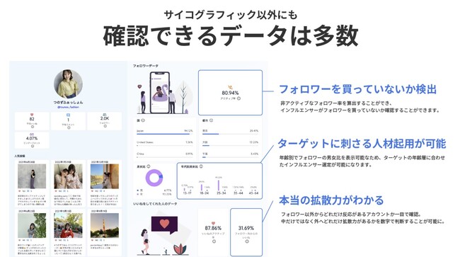 また、1アカウントの分析項目は30以上と多岐に渡り、様々な角度からPRにおけるベストなインフルエンサー探しをサポートしています。