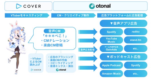 カバー社がVTuberのキャスティングを、オトナルがCM・クリエイティブ制作や広告配信をそれぞれ務め、広告主のデジタル音声マーケティングをワンストップで支援します。