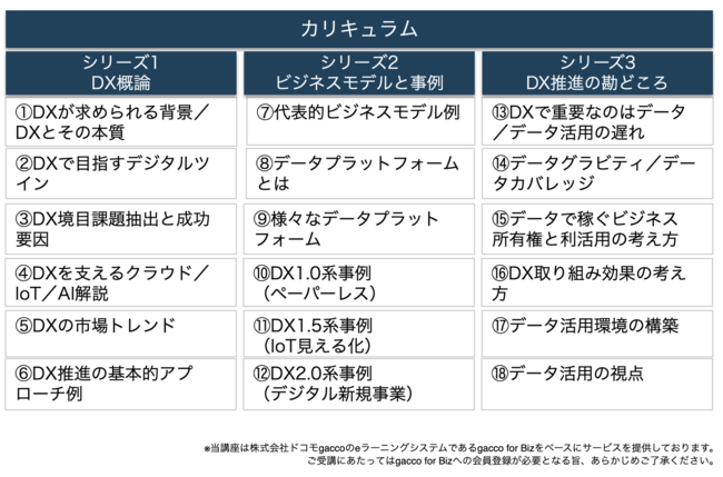 このような背景により、DX時代の新しい企業研修・法人向けeラーニングサービス「gacco for Biz」のLMS(学習管理システム)を活用して、「DX基礎講座」を開講することとしました。