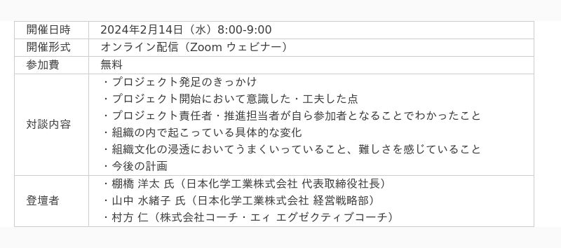 コーチ・エィは、日本化学工業株式会社をお招きし、組織変革プロジェクトに関する対談イベントを2024年2月14日(水)に開催いたします。