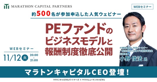 ヤマトヒューマンキャピタル株式会社(本社:東京都千代田区、代表取締役:堀江 大介)は、2024年11月12日(火) 20:00よりオンラインにて、マラトンキャピタルパートナーズ株式会社の代表取締役/共同パートナー/一般社団法人日本プロ経営者協会代表理事の小野 俊法氏にご登壇いただくウェビナー『PEファンドのビジネスモデルと報酬制度徹底公開』を開催いたします。