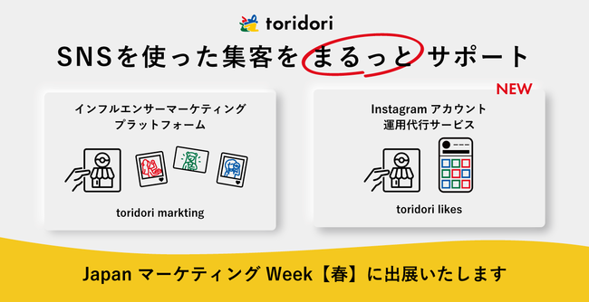 インフルエンサータイアップ広告『toridori promotion』やPR実績30万件のインフルエンサーマーケティングプラットフォーム『toridori marketing(トリドリマーケティング)』を運営する株式会社トリドリ(本社:東京都渋谷区、代表取締役社長:中山貴之、証券コード:9337、以下toridori)は、2023年4月5日(水)~7日(金)に東京ビッグサイトにて開催予定の「第6回 JapanマーケティングWEEK【春】(Web・SNS活用EXPO)」(以下JapanマーケティングWeek【春】)に出展いたします。