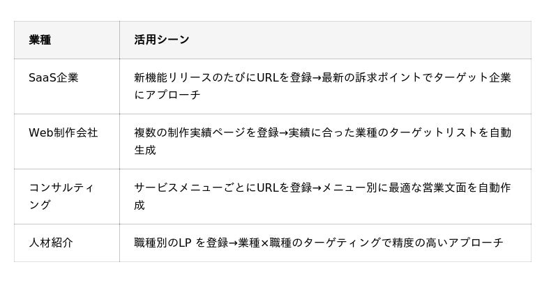 利点1.:営業文面の作成時間を大幅短縮従来、営業テンプレートの作成には「自社サービスの整理→ターゲットの選定→文面の作成→社内レビュー」と、数時間~数日を要していました。サービス分析AIにより、URL入力から営業テンプレート完成までわずか数分で完了。営業担当者は「送る作業」に集中できます。