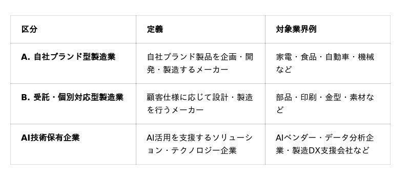 想定参加者は、製造業におけるDX推進担当者、AI導入リーダー、新規事業開発者、およびAI技術企業の専門家です。