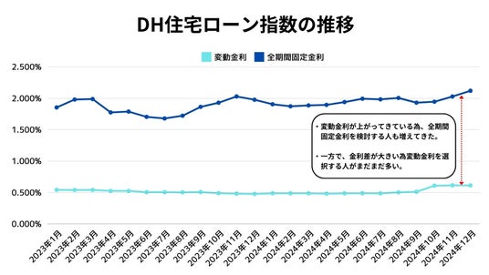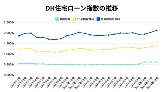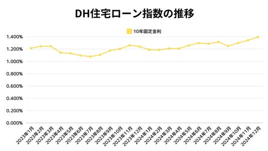 2024年12月初めのDH住宅ローン指数の10年固定は1.394%となり、前月の1.342%よりも